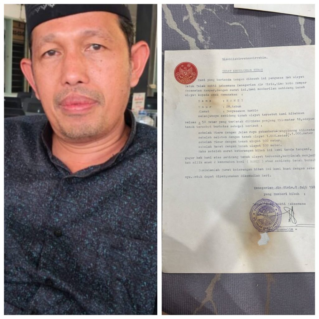 Dalam hibah tersebut, tanah ulayat Kenegerian Airtiris seluas kurang lebih 50 hektare di Rimbo Panjang Kilometer 18 dihibahkan kepada Ramzi sebagai kemenakan, dengan batas-batas yang jelas dan tegas. Hibah tersebut dilakukan menurut mekanisme hukum adat yang berlaku dan tidak pernah dicabut, dibatalkan, ataupun dinyatakan gugur melalui keputusan adat mana pun.