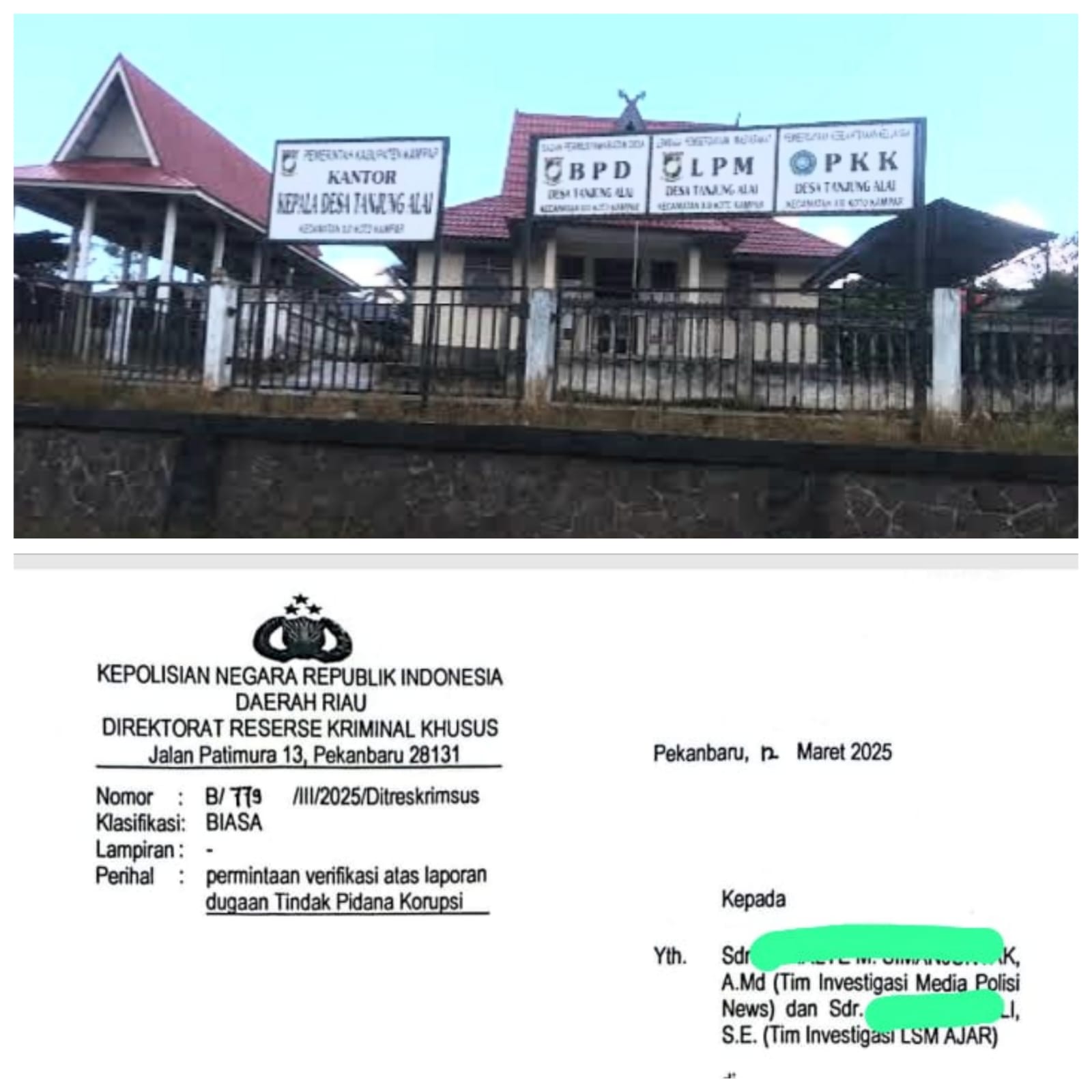 Polda Riau melalui Krimsus Polda Riau resmi menindak lanjuti laporan LSM AJAR (Aliansi Jurnalis Anti Rasuah) terhadap Kades Tanjung Alai Kecamatan XIII Koto Kampar Kabupaten Kampar Provinsi Riau atas Dugaan Korupsi Dana Desa tahun 2019 s/d 2023.