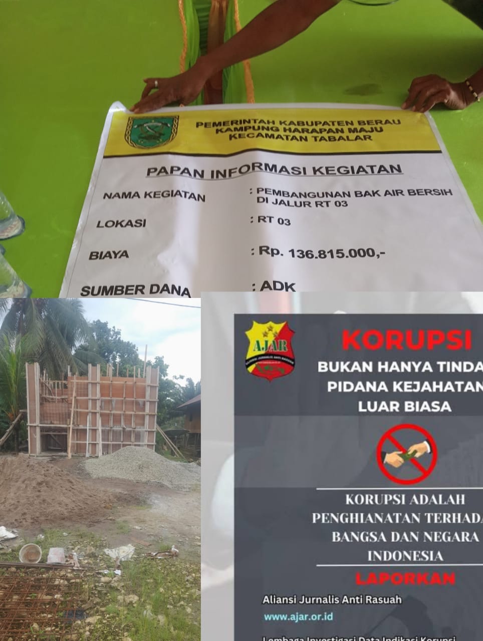 Berau,Kaltim – LSM Anti Korupsi AJAK (Aliansi Jurnalis Anti Korpsi) akan laporkan pembagunan tujuh buah bak air bersih di Kapung Harapan Maju Kecamatan Tabalar Babupaten Berau Kalimantan Timur yang bersumber dari dana ADK senilai Rp.978.120.000 (sembilan ratus tujuh puluh delapan juta seratus dua puluh ribu rupiah) .tak kelar hingga sat ini