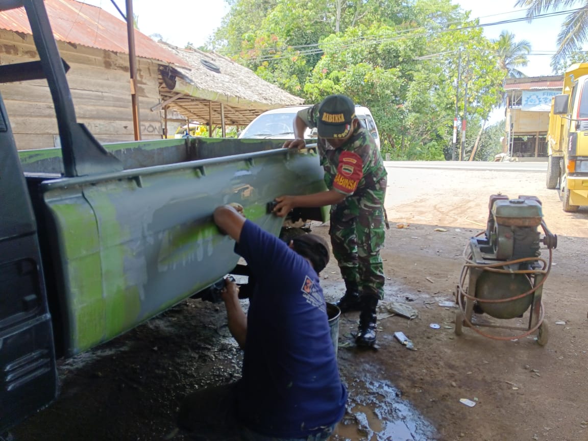 Dalam kegiatan anjangsa tersebut, Babinsa melaksanakan kegiatan Komunikasi Sosial (Komsos) dan turut membantu Pemilik Bengkel mendumpul pinggiran bak mobil pikap milik pelanggan bengkel.