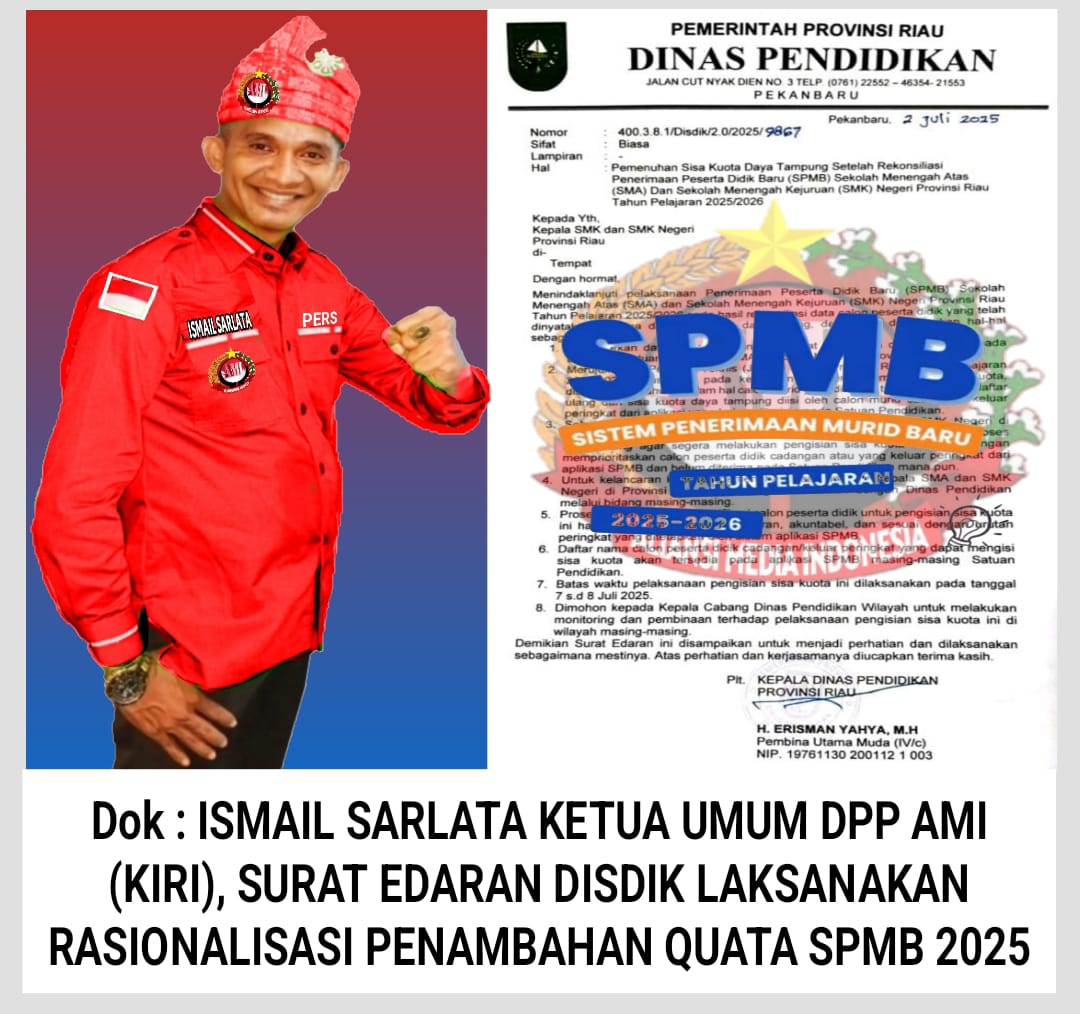 ” Pak H Abdul Wahid Gubernur Riau, untuk tidak berbangga hati dulu akan pelaksanaan SPMB tahun 2025 dinyatakan berhasil oleh oknum-oknum Dinas Pendidikan sebagaimana laporan yang telah diberikan kepada bapak sebagai Gubernur, karena laporan mereka belum tentu dapat dipertanggungjawabkan sebelum dijui kebenaranya oleh masyarakat maupun elemen masyarakat ” ucap Ismail Sarlata Ketua Umum Dewan Pimpinan Pusat Aliansi Media Indonesia (DPP-AMI) yang peduli akan dunia pendidikan dalam pres rilisnya kepada media.Sabtu (12/07/2025)
