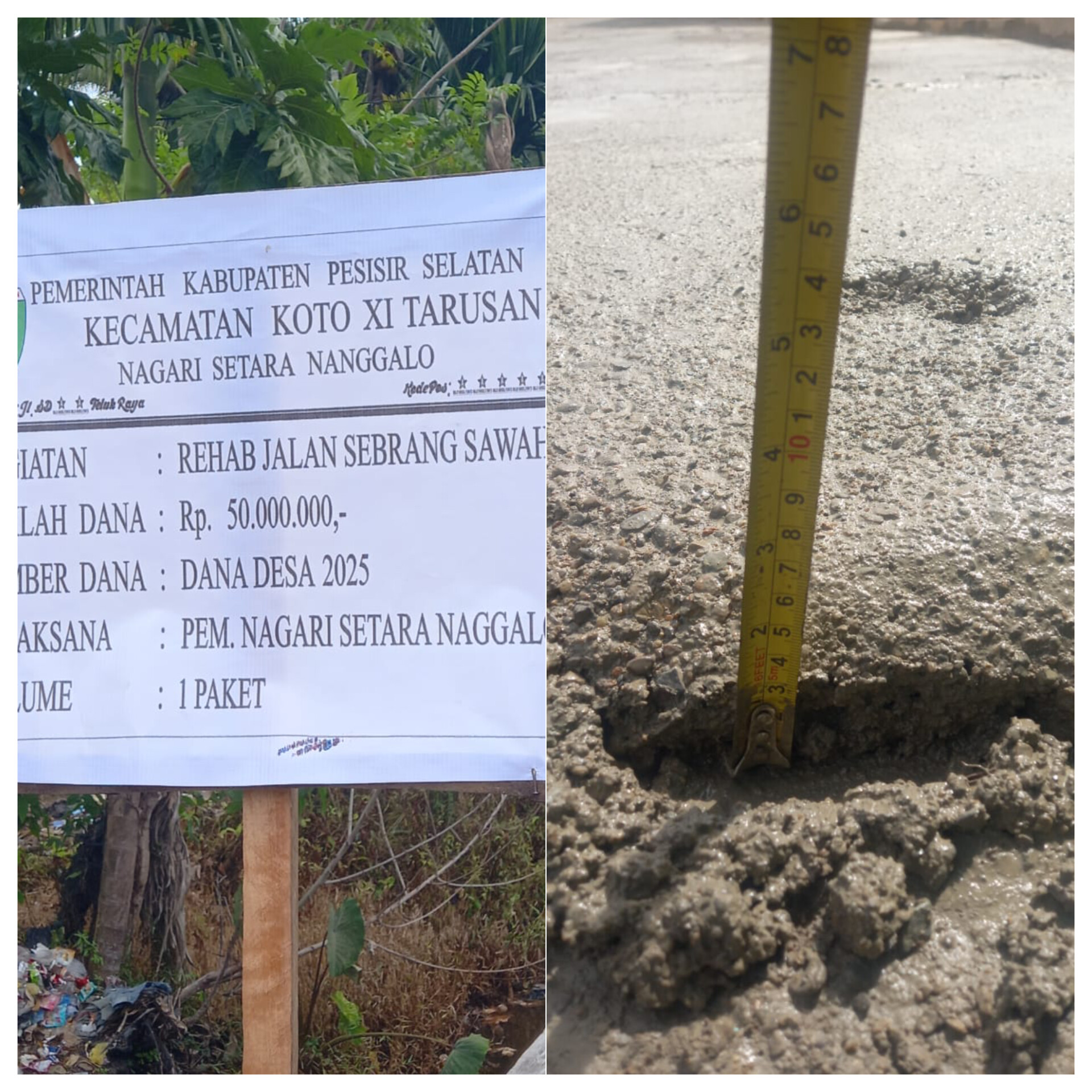 Viral 24jam.id|Pessel-Proyek rehabilitasi jalan di seberang sawah Nagari Setara Nanggalo, Kecamatan Koto XI Tarusan, Kabupaten Pesisir Selatan menuai kekecewaan dari masyarakat.