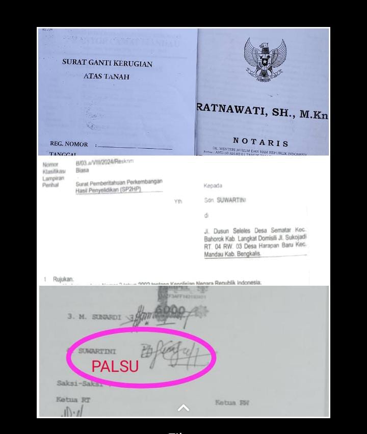 dan setelah saya lihat dan baca surat tanah yang menjadi dasar hukum untuk melaporkan, saya lihat ada tanda tangan nama saya padahal saya sama sekali tidak ada melakukan tanda tangan pada surat yang ada pada S ipar saya itu , lalu saya membuat laporan pengaduan ke Polsek Mandau tentang Memalsukan tanda tangan dan Surat Tanah diduga palsu yang dilakukan oleh S ipar saya.dan saya pernah menelepon penyidik pembantu Bripka RR yang menangani laporan saya tentang tandatangan palsu, pada tanggal 12 Agustus jam 11.56 siang menanyakan perihal perkembangan laporan Saya, lalu di jawab oleh penyidik pembantu, ibu kan sudah saya mintai keterangan, dan saksi saksi sudah saya periksa dan ibu S pun sudah Saya surati itu jawab penyidik pembantu Bripka RR tapi S tidak datang, sungguh aneh jawaban Bripka RR sementara SP2HP yang di berikan oleh Polsek Mandau tertanggal 12 Agustus 2024 dan RTL rencana tindak lanjut baru akan memanggil S dan Suparman, jadi saya bingung dari penjelasan penyidik mana yang sebenarnya, imbuh Suwartini,