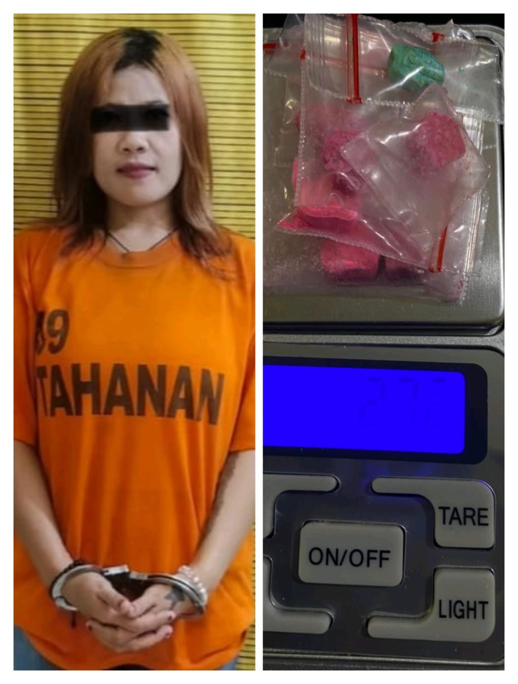 Saat itu juga petugas langsung melakukan penangkapan terhadap terduga sehingga ditemukan padanya barang bukti berupa, 8 (delapan) butir diduga pil Ekstasi yang dibungkus dengan plastik klip transparan dengan berat bruto 2,72 gram serta 1 (satu) buah tas warna hitam.