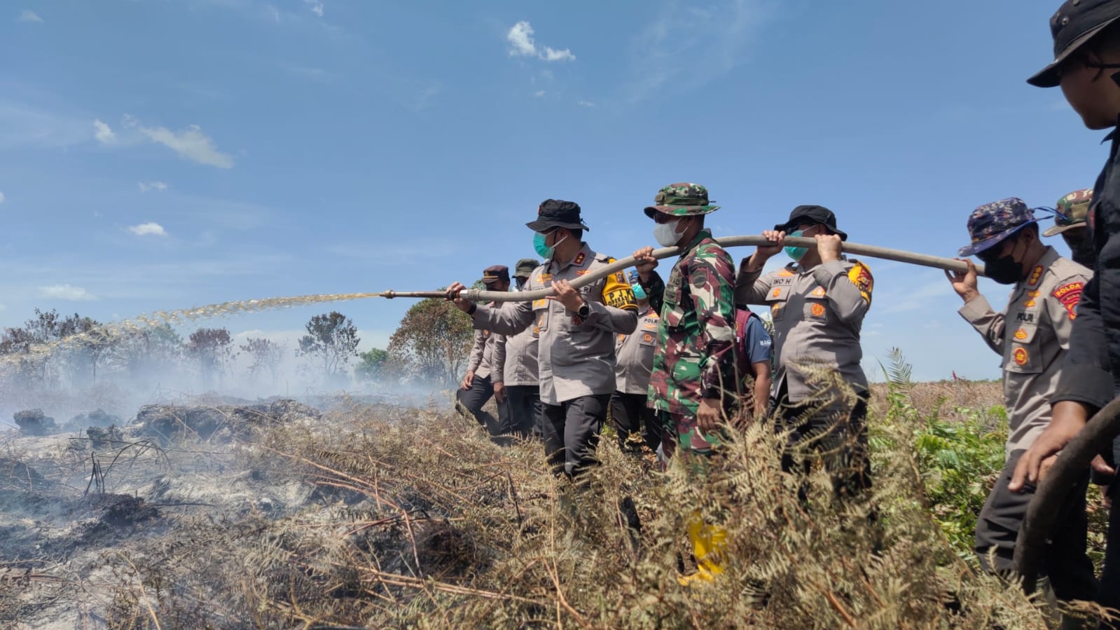 VIRAL24JAM.ID,RIAU.-Aparat Kepolisian, TNI hingga Badan Penanggulangan Bencana Daerah (BPBD) Provinsi Riau berkolaborasi bersama dalam upaya penanganan kebakaran hutan dan lahan (karhutla) di Kabupaten Rokan Hilir (Rohil). Sebanyak 98 personel turun berjibaku memadamkan titik api yang ada di Kelurahan Sei Gajah Induk, Kecamatan Kubu.