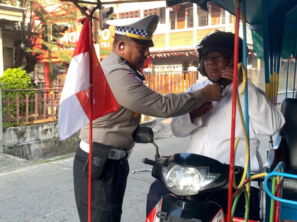 Bendera dibagikan kepada masyarakat dijalan Tengku Umar Kecamatan Tebingtinggi Kabupaten Kepulauan Meranti, kegiatan ini juga serentak dilakukan dengan himbauan ke masyarakat yang berlalu lintas agar tetap tertib berkendara dan tetap mengutamakan keselamatan pengendara