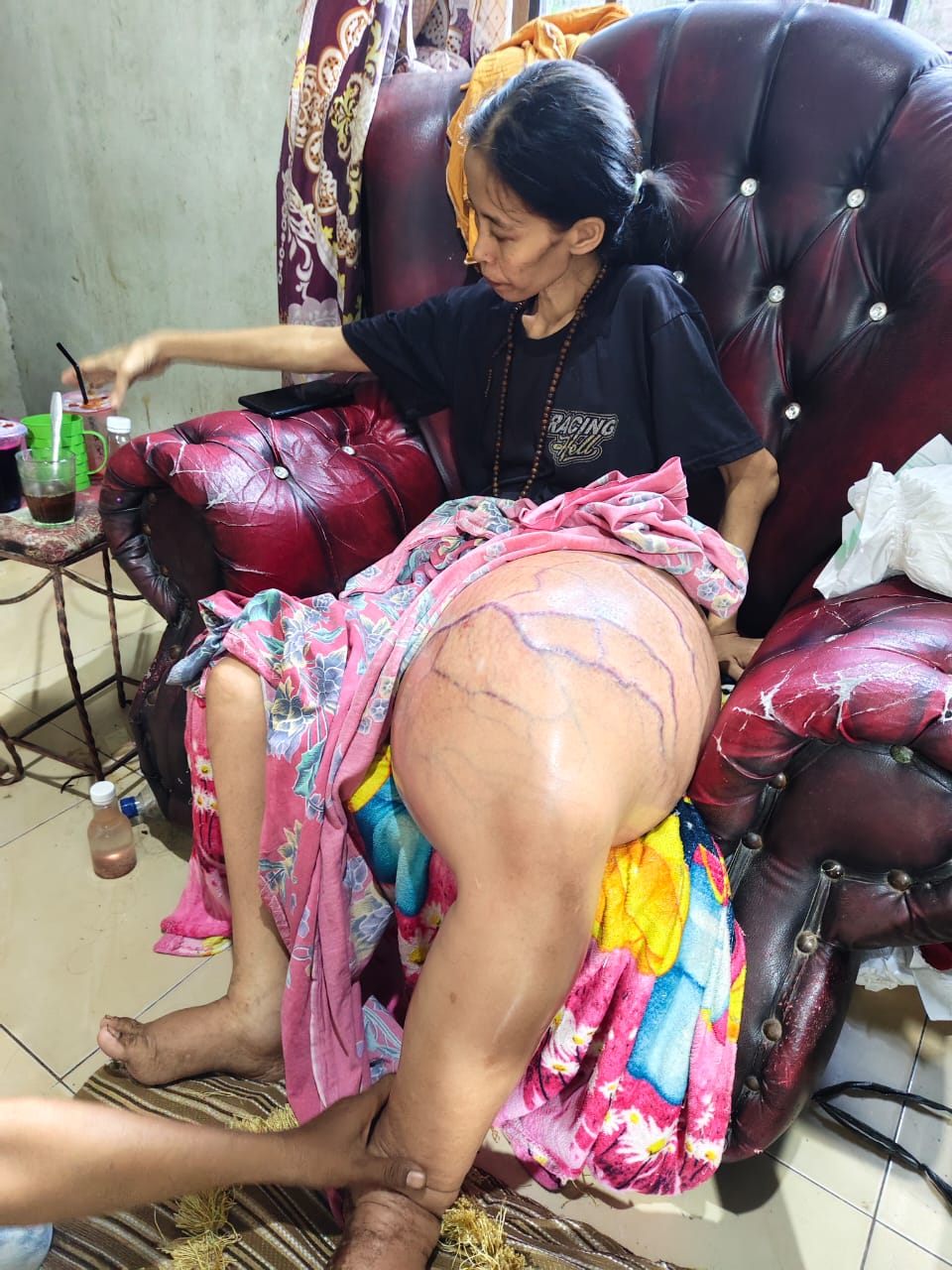 Sri Rahayu tidak menyangka akibat dirinya terjatuh saat berjalan pada dua tahun silam membawa penyakit tumor , awalnya tidak menunjukkan reaksi namun setahun kemudian pahanya mulai membesar hingga sampai ke pinggul.