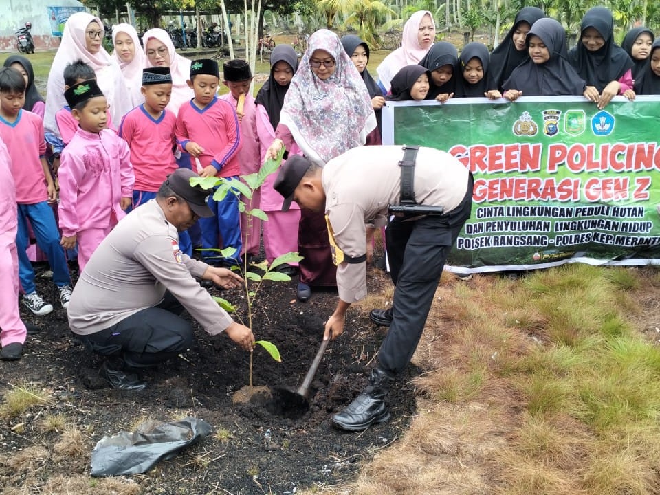 Green Policing yang dilaksanakan kegiatan penanaman pohon TK Al Muawanah Desa Alahair Kec. Tebingtinggi, SDN 05 Desa Dwi Tunggal Kec. Rangsang dan SMA Kalam Kudus Kabupaten Kepulauan Meranti, pada Jumat (15/8/2025).