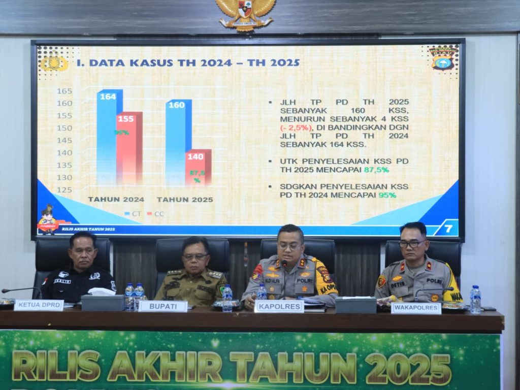 AKBP Aldi mengungkapkan, sepanjang 2025 angka kriminalitas di wilayah hukum Polres Kepulauan Meranti mengalami penurunan sebesar 2,5 persen. Jika pada 2024 tercatat 164 kasus, maka pada 2025 jumlahnya turun menjadi 160 kasus.