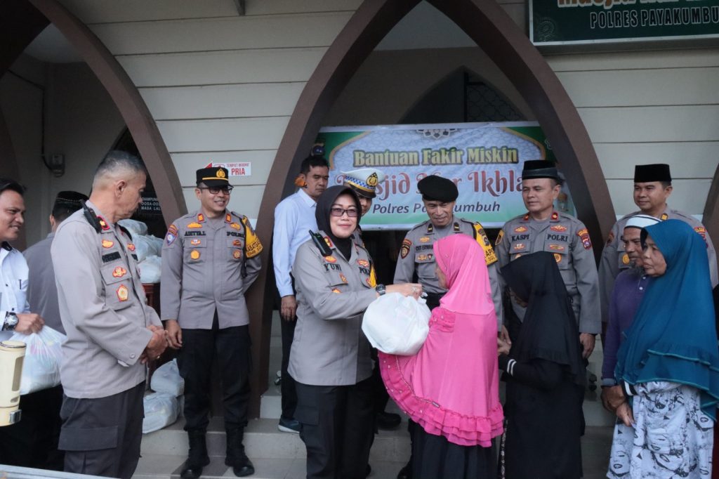 Dihadiri Kapolres Payakumbuh AKBP Wahyuni Sri Lestari, Wakapolres Kompol Russirwan san beberapa pejabat utama, puluhan paket sembako diberikan kepada fakir miskin bertempat di Mesjid Mur Ikhlas Polres Payakumbuh, Senin (25/03).