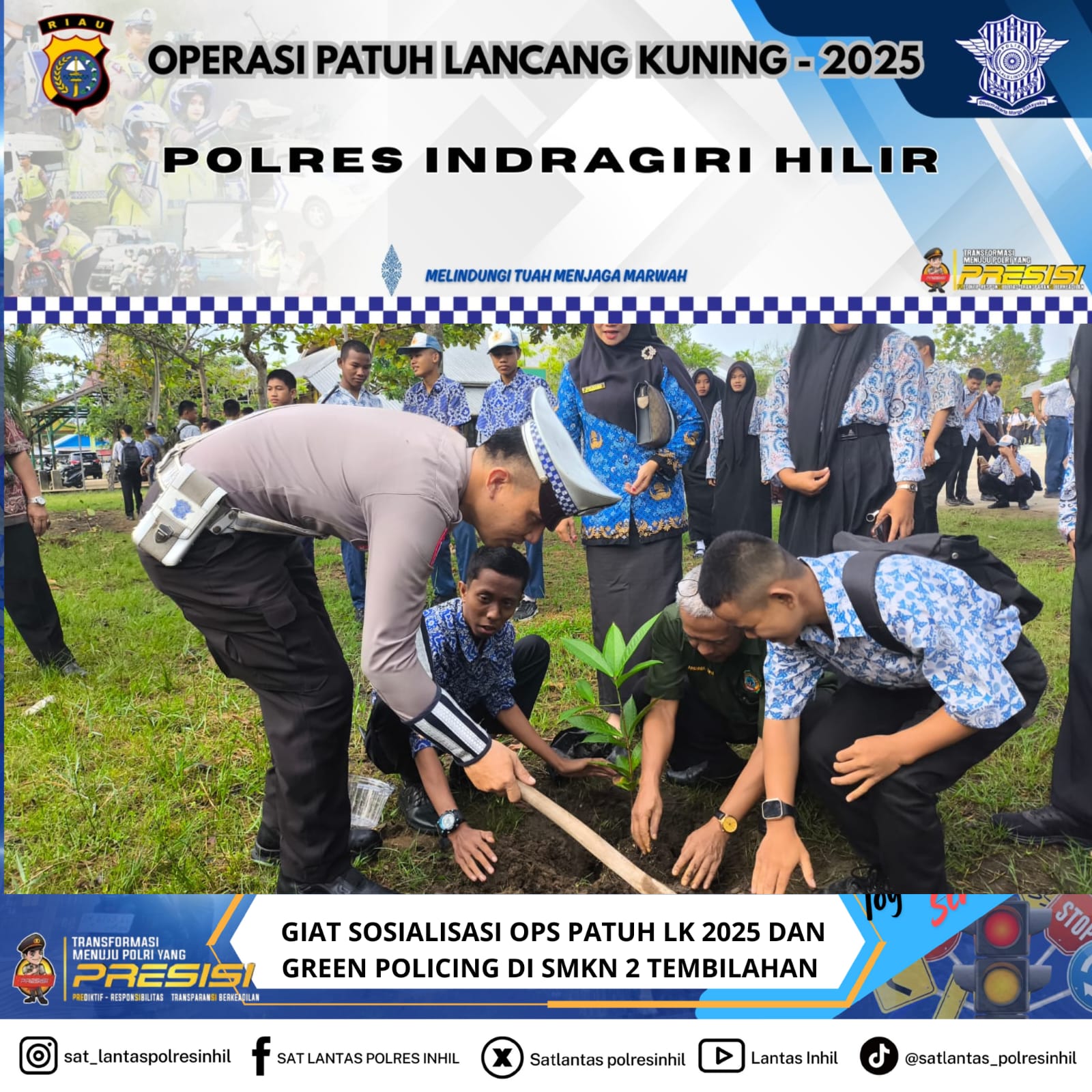 VIRAL24JAM.ID,INHIL.-Dalam rangka menyukseskan pelaksanaan Operasi Patuh LK 2025 dan mendukung program Green Policing, Satuan Lalu Lintas Polres Indragiri Hilir menggelar kegiatan sosialisasi sekaligus penanaman pohon di SMKN 2 Tembilahan, Jalan SKB, Kecamatan Tembilahan, Kamis (17/7/2025).