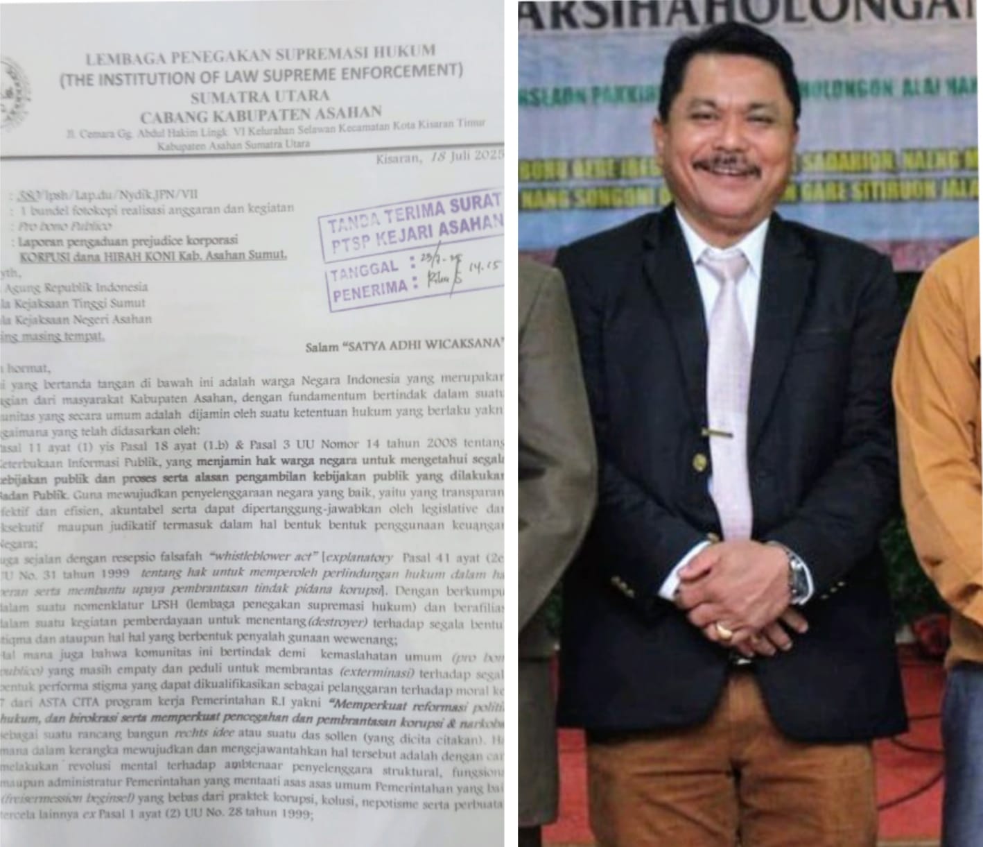 Laporan ini berdasarkan surat pengaduan dari Lembaga Penegakan Supremasi Hukum ((LPSH) Cabang di Kabupaten Asahan bernomor : 380/lpsh/Lap.du/Nydik.JPN/VII tertanggal 18 Juli 2025 ditujukan kepada Jaksa Agung Republik Indonesia, Kejatisu dan Kejari Asahan yang memuat laporan pengaduan prejudice korporasi dugaan korupsi dana hibah KONI Kabupaten Asahan, Sumatera Utara (Sumut) senilai Rp 52,5 miliar lebih.