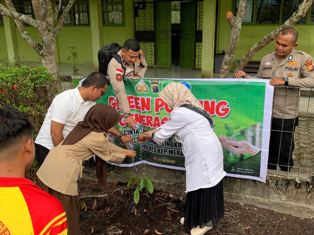 Viral24jam. Meranti– GREEN POLICING, Konsep kegiatan Peduli lingkungan berupa penanaman pohon, kegiatan ini dilaksanakan di wilayah Sekolah MTS N 1 Selatpanjang, Kec Tebing Tinggi, SDN Kec Rangsang Barat dan SMA 2 Negeri Tebing Tinggi Kel, Kec Tebing Tinggi Kab Kep Meranti (22/8/25)