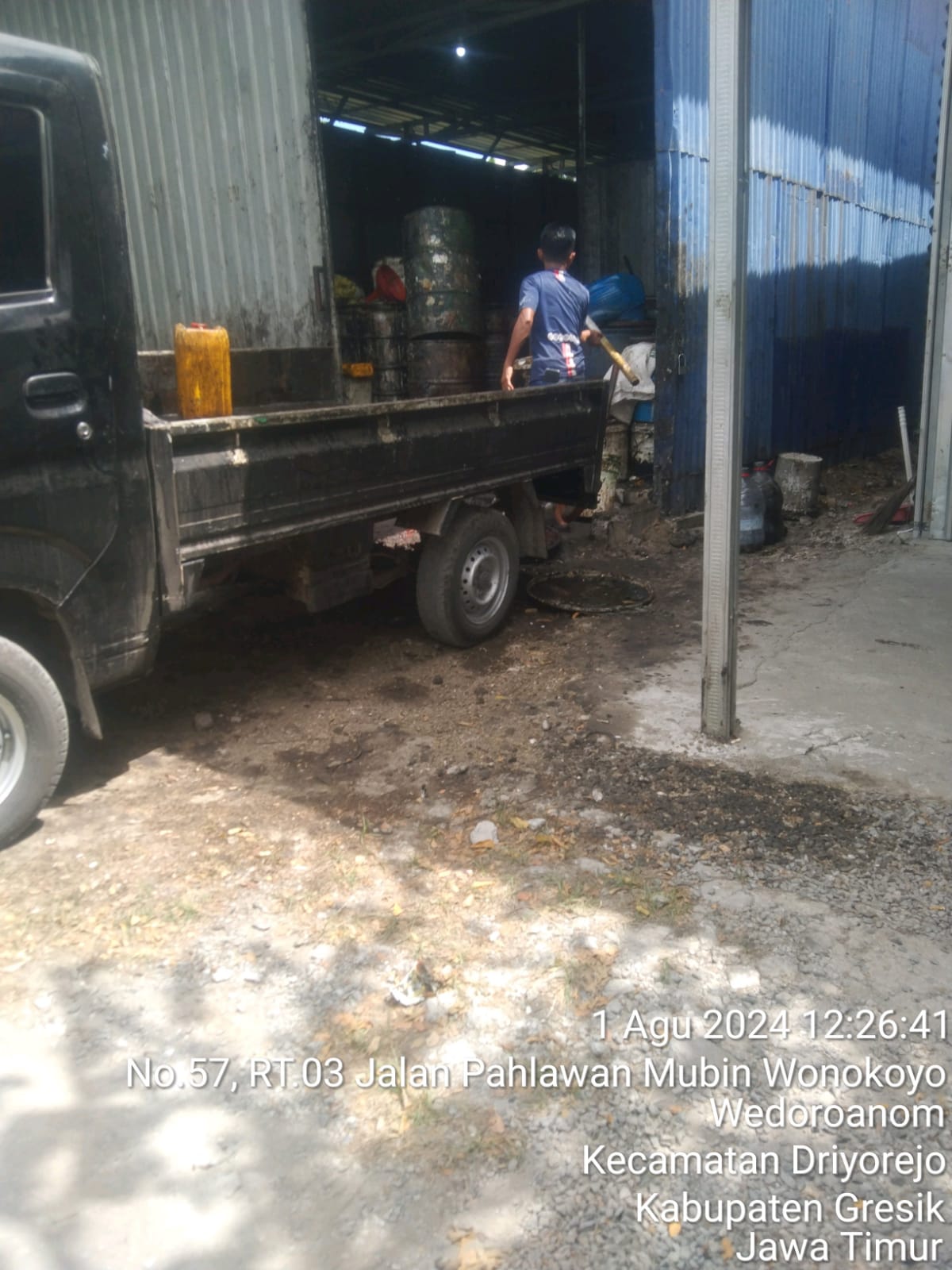 GRESIK,-1 Agustus 2024 / Di pinggir jalan wilayah Desa Wedoroanom, Kecamatan Driyorejo, Gresik. Saat melintas ditemukan gudang pengolahan minyak jenis CPO yang diduga tidak memiliki izin resmi. Menurut informasi yang diperoleh dari Mas Alam, bahan dasar minyak goreng sawit ini diolah menjadi makanan untuk ayam petelur, bebek, dan unggas lainnya.
